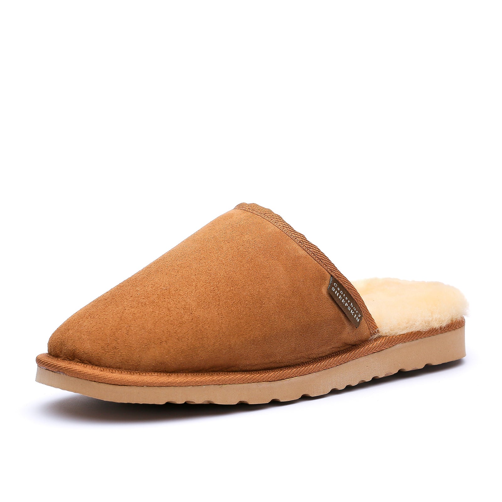 Roman is a warm and versatile unisex sheepskin scuff with a hard wearing man made sole. It is available in chestnut sheepskin twinface and finished with a nylon binding.