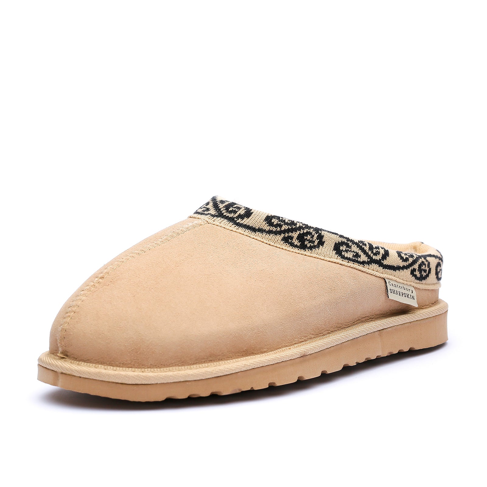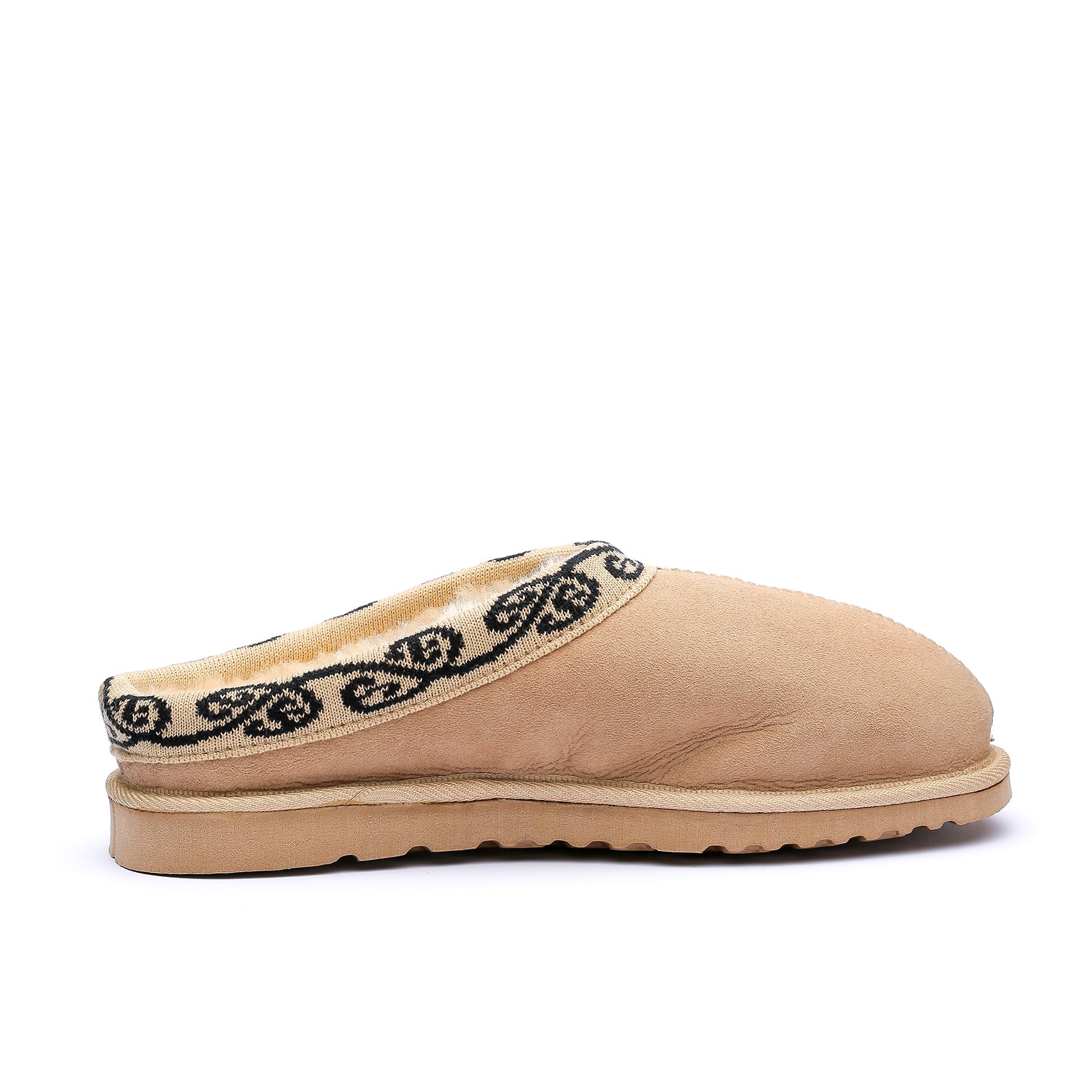 Tattoo scuff is a supremely well made clogg style unisex slipper that is very well designed, providing great comfort to its wearer. Sueded centre seamed sheepskin toe cap, raised back with a Koru patterned band. With its centre seam construction this slipper provides excellent comfort and the raised lip at the back helps keep you foot in the slipper better than a straight scuff.
